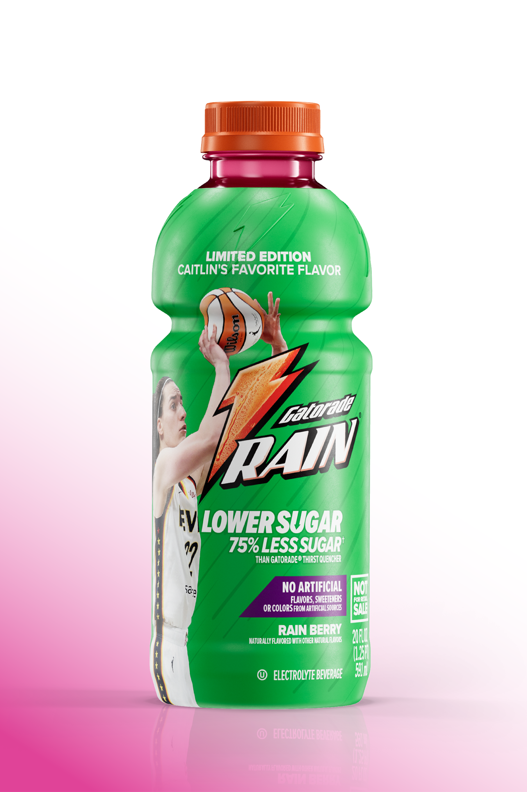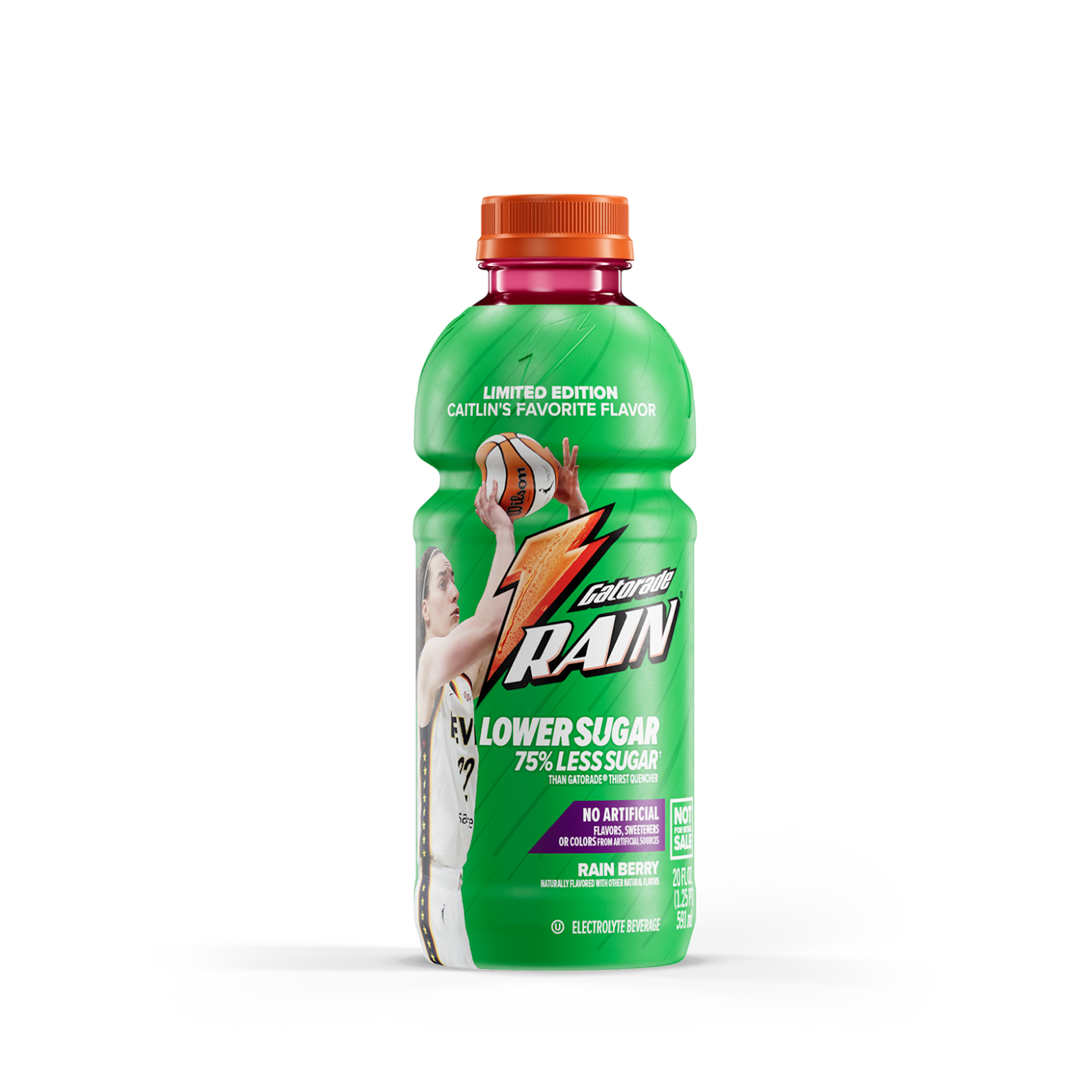 - 20 oz Gatorade Lower Sugar Rain Berry bottle with custom Caitlin Clark label